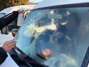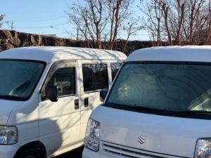朝、社用車のフロントガラスが凍りついていました。