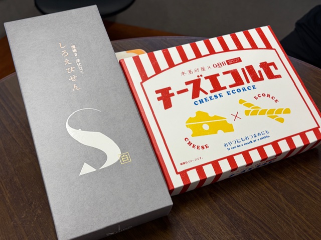 企業コラボの商品と白いエビせんです。