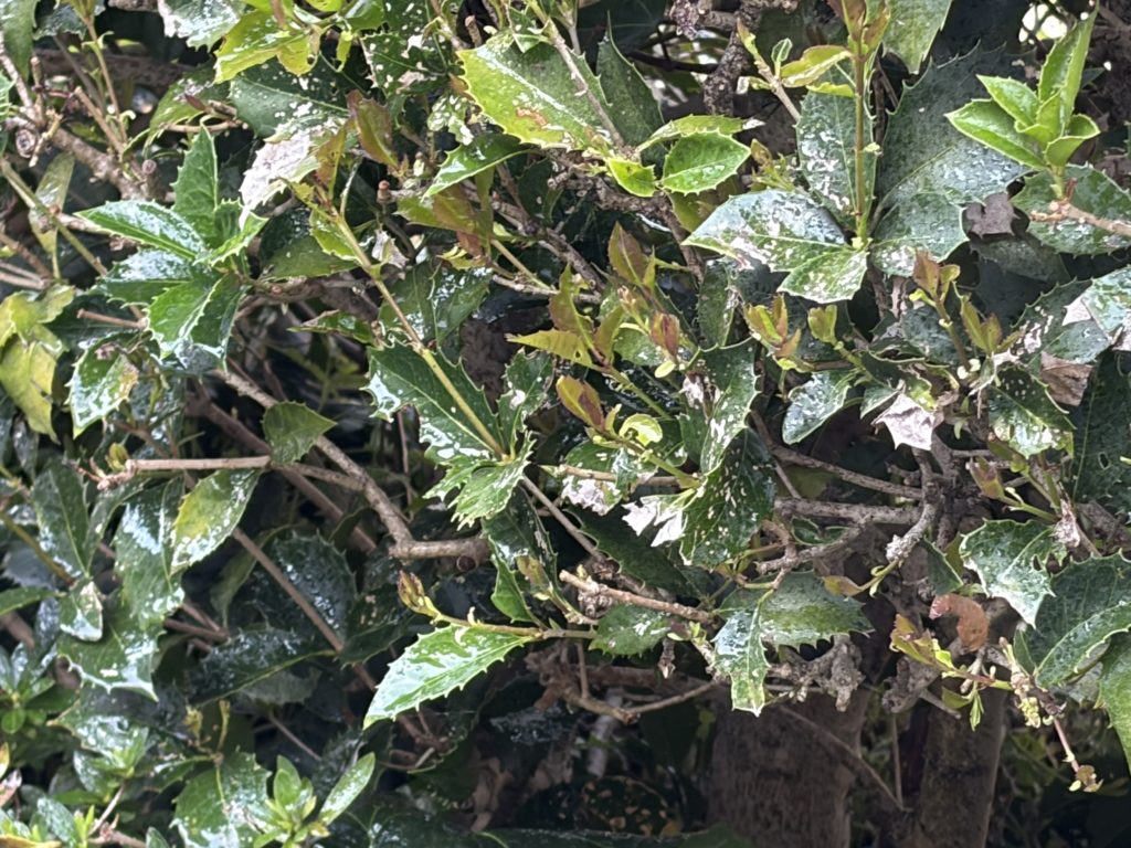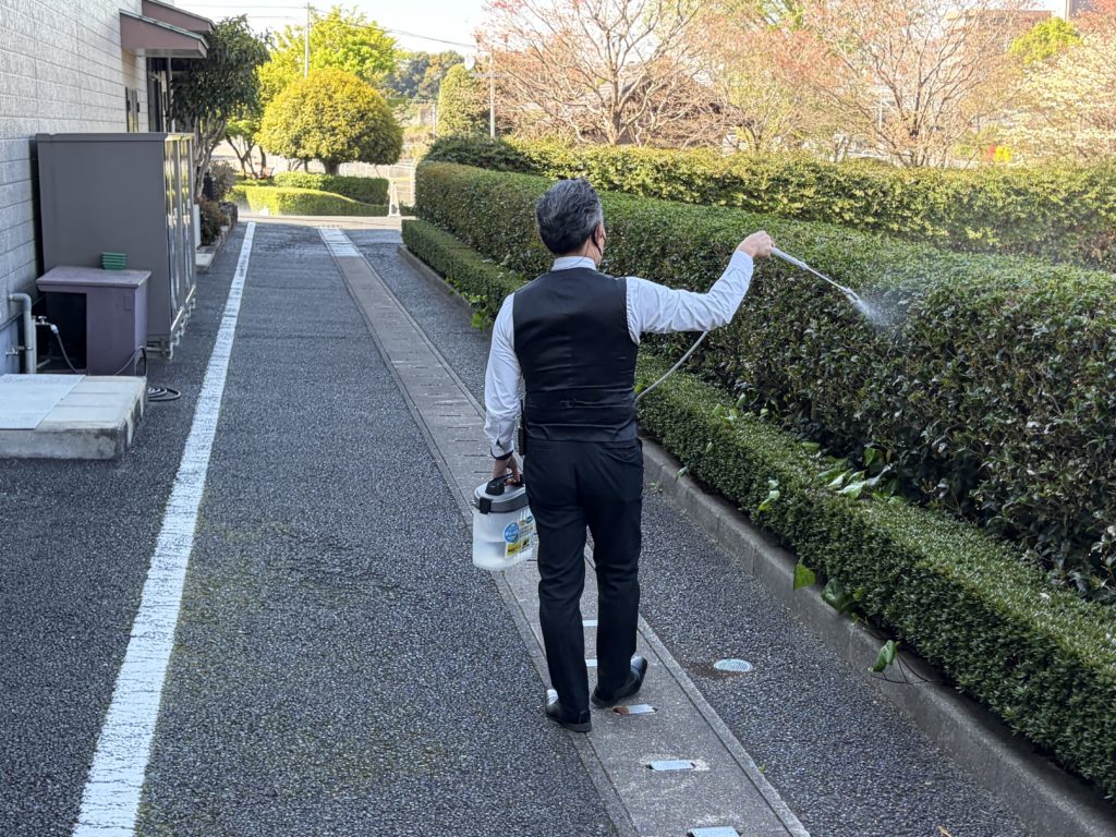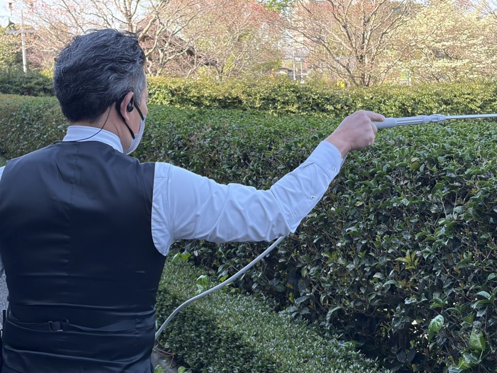 植え込みの葉も少しずつ食べられていたため、早めの対策として殺虫剤を散布しました。